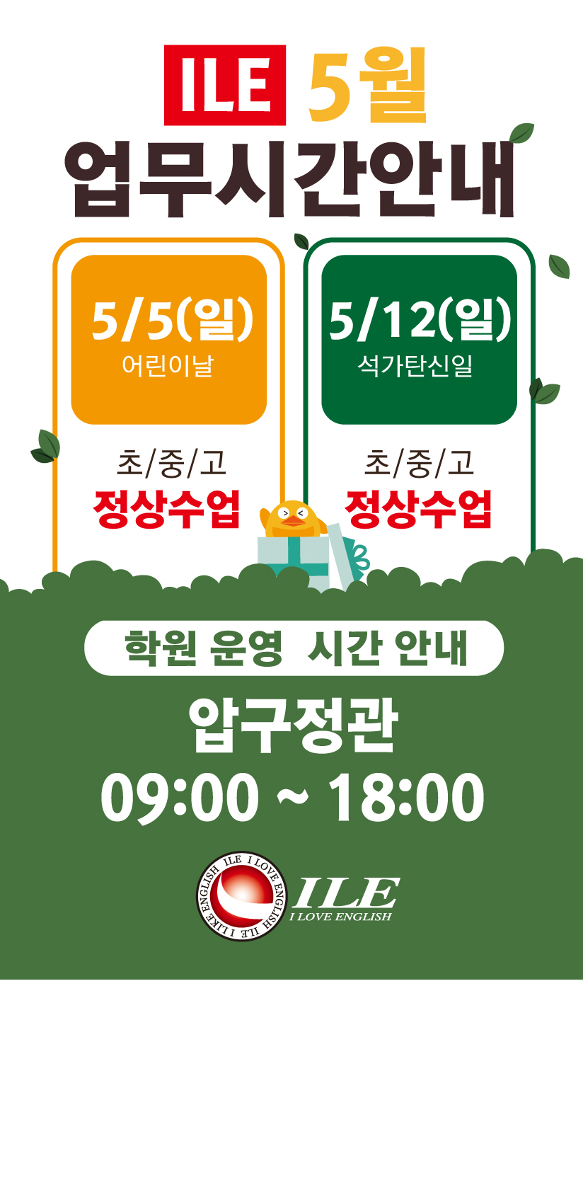 ILE 2019 5월 어린이날, 석가탄신일날 업무시간안내[압구정]